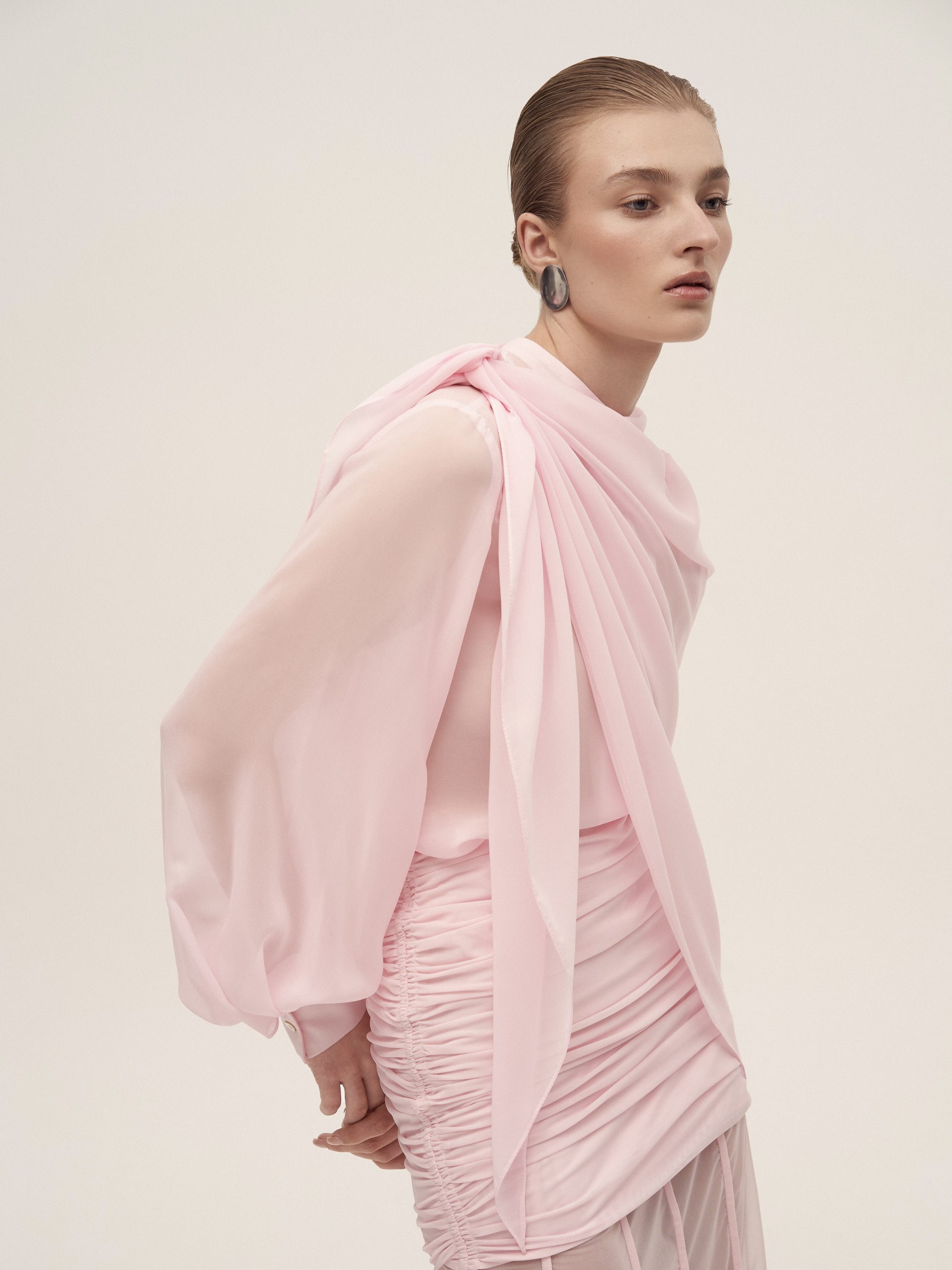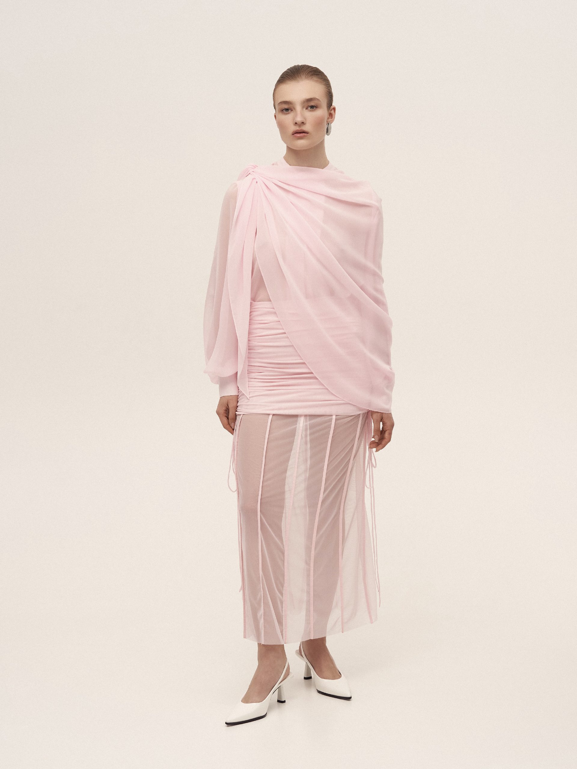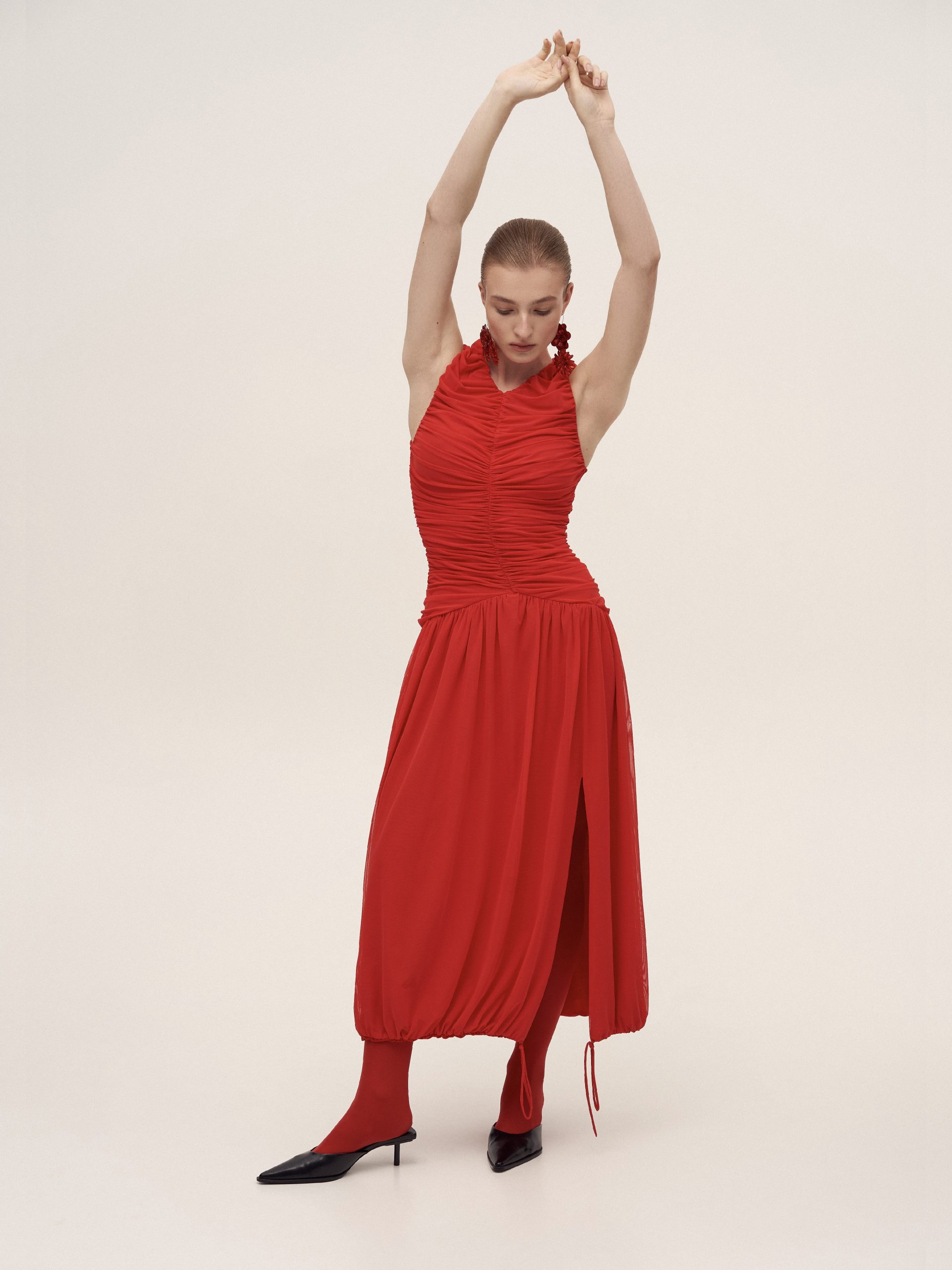 Центральним образом стала червона сукня з сітки, оздоблена драпірування; поділ спідниці збирається на кулісці, що створює контраст стилів. Сукня символізує внутрішню силу та енергію.