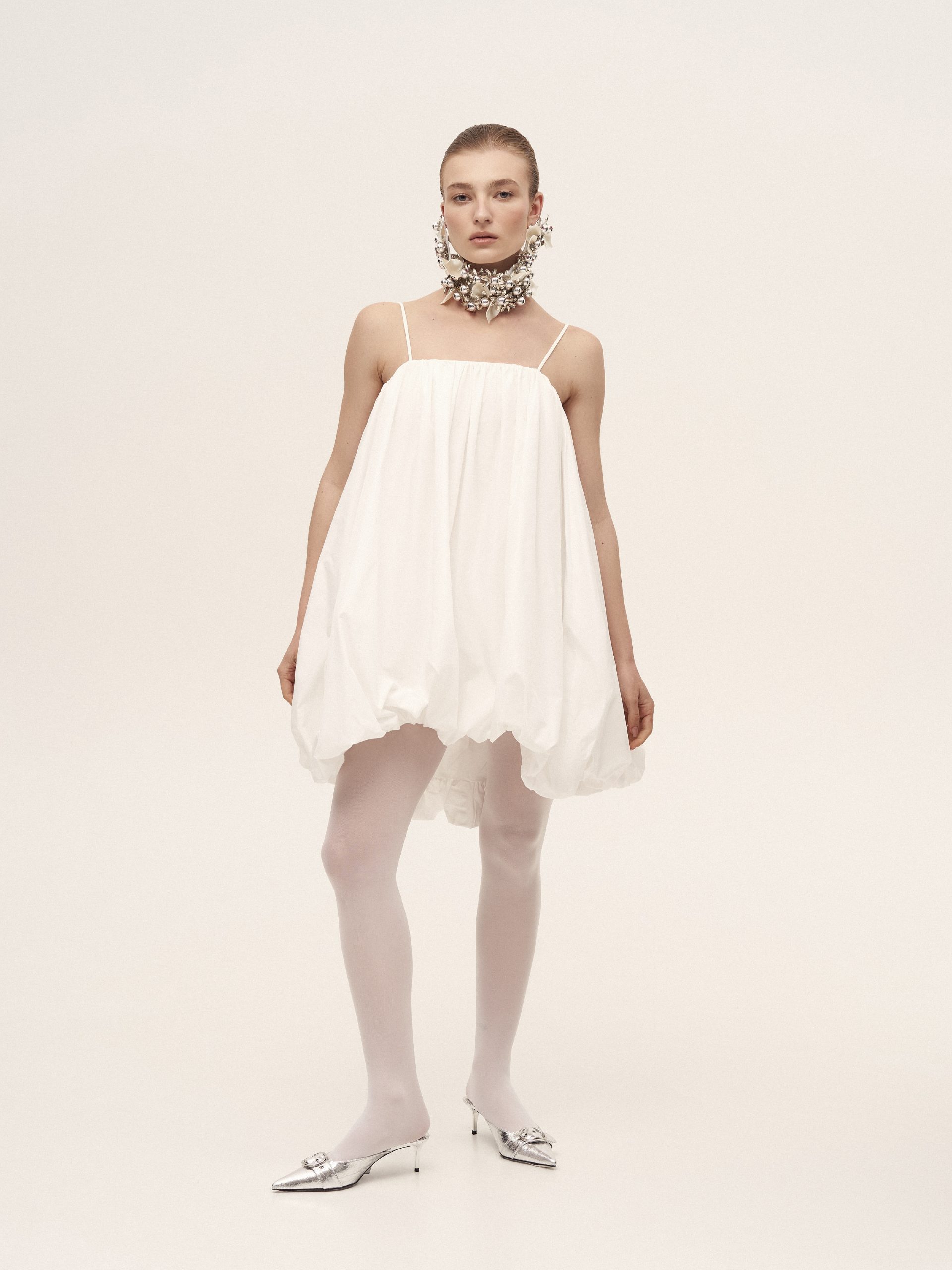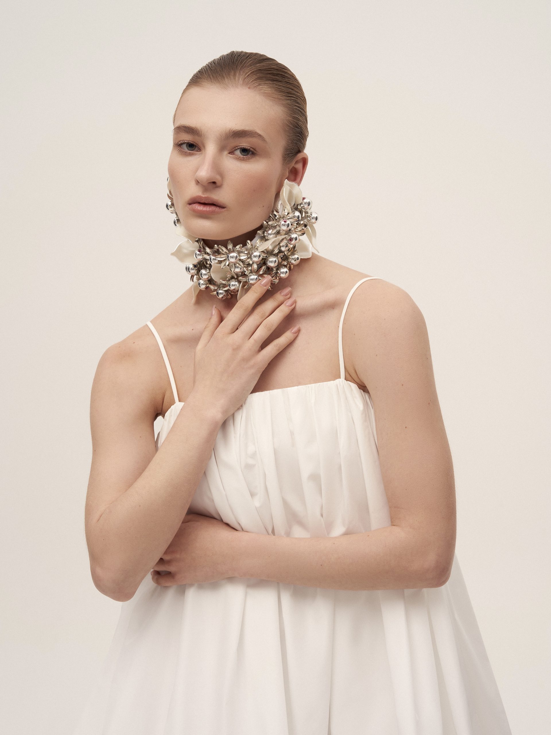 У колекції використані різні фактури і матеріали: структурований денім і тафта поєднуються з шовковим шифоном та сіткою. Невагомі напівпрозорі матеріали у виробах уособлюють легкість буття, в той час як необроблені краї нагадують про його крихкість та неідеальність.