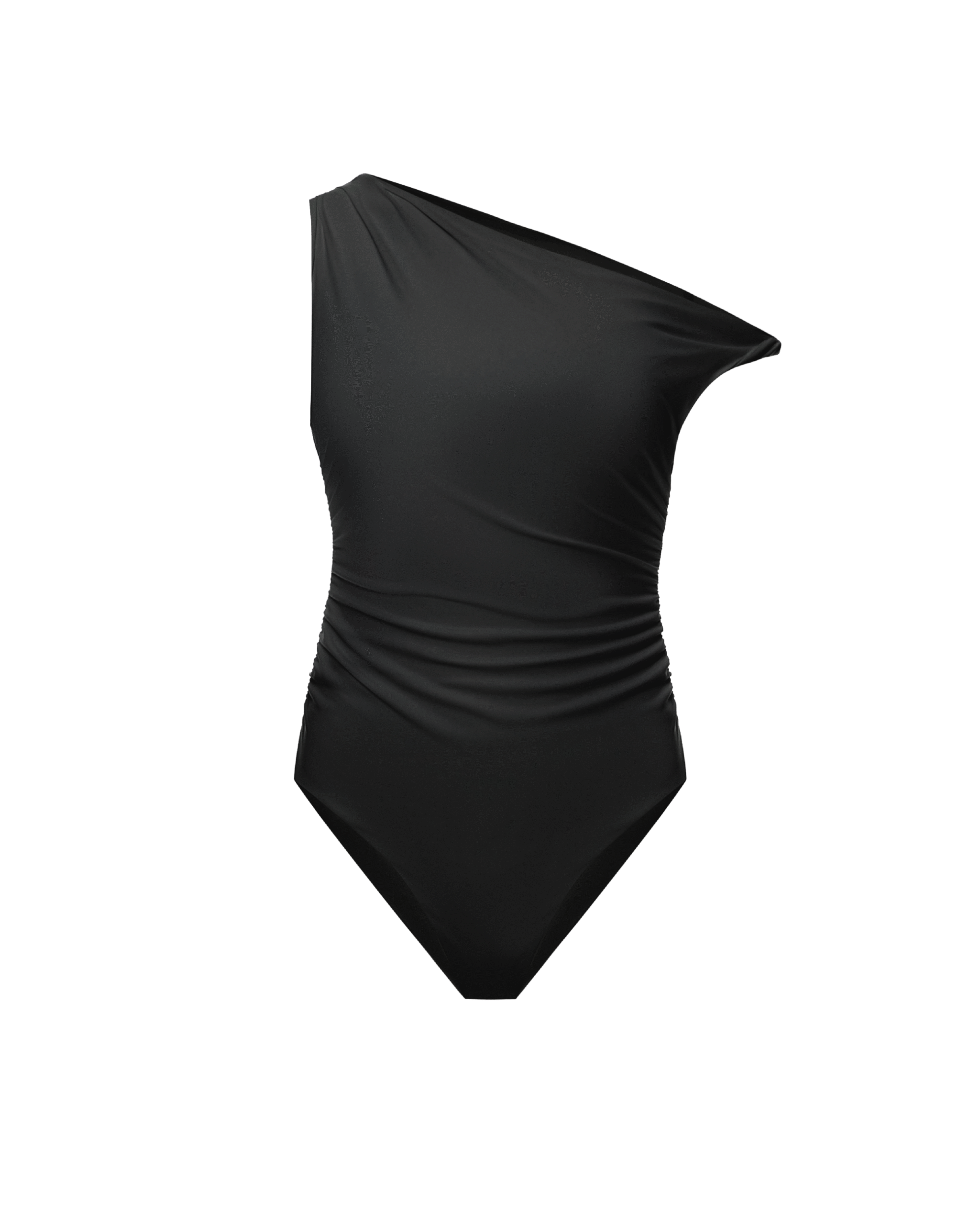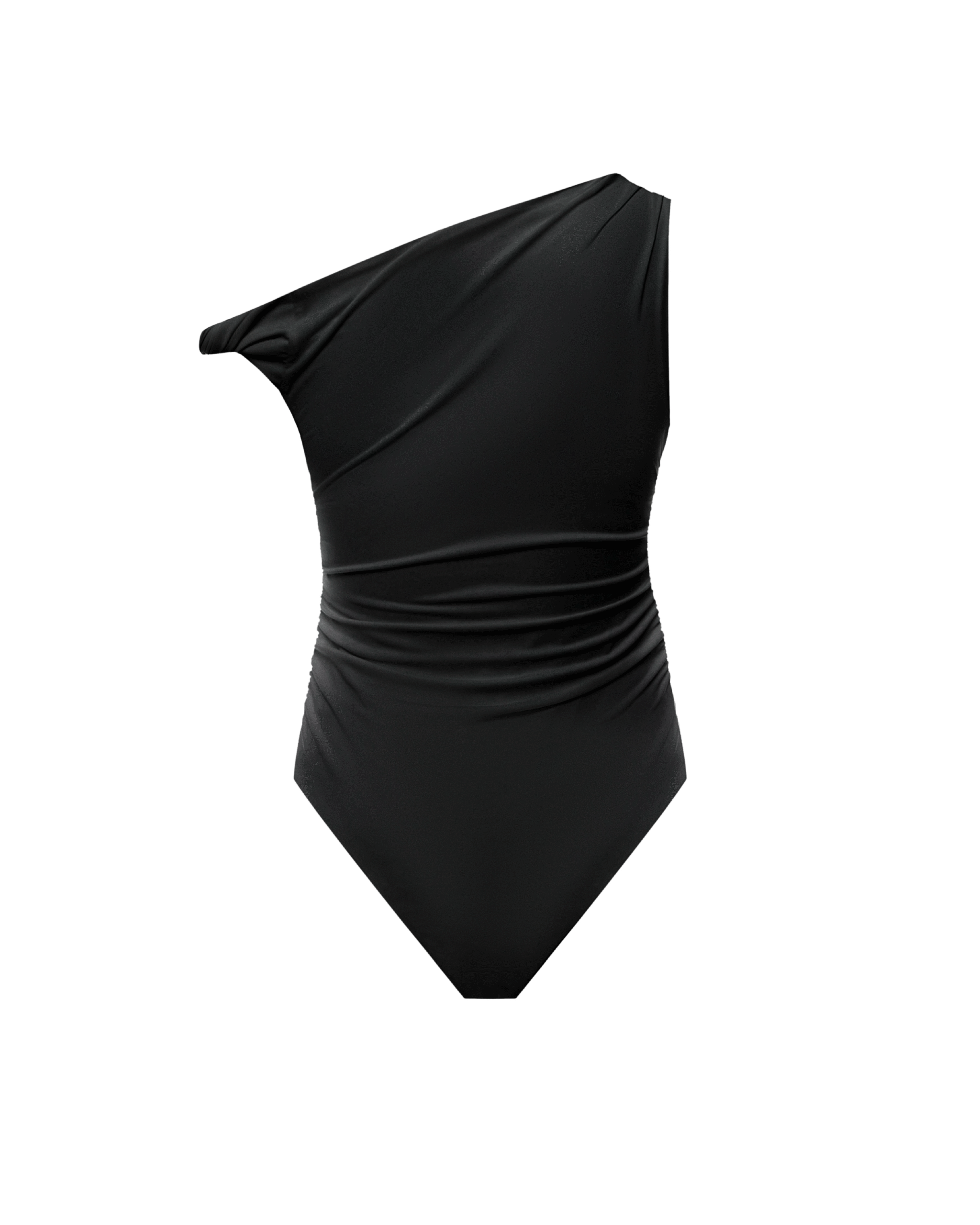 Боді-купальник з відкритим плечем, виготовлений з мʼякого матового біфлексу. Оздоблений скрученою деталлю та мʼяким драпіруванням. Виріб комфортний та непрозорий на тілі завдяки подвійному шару тканини.