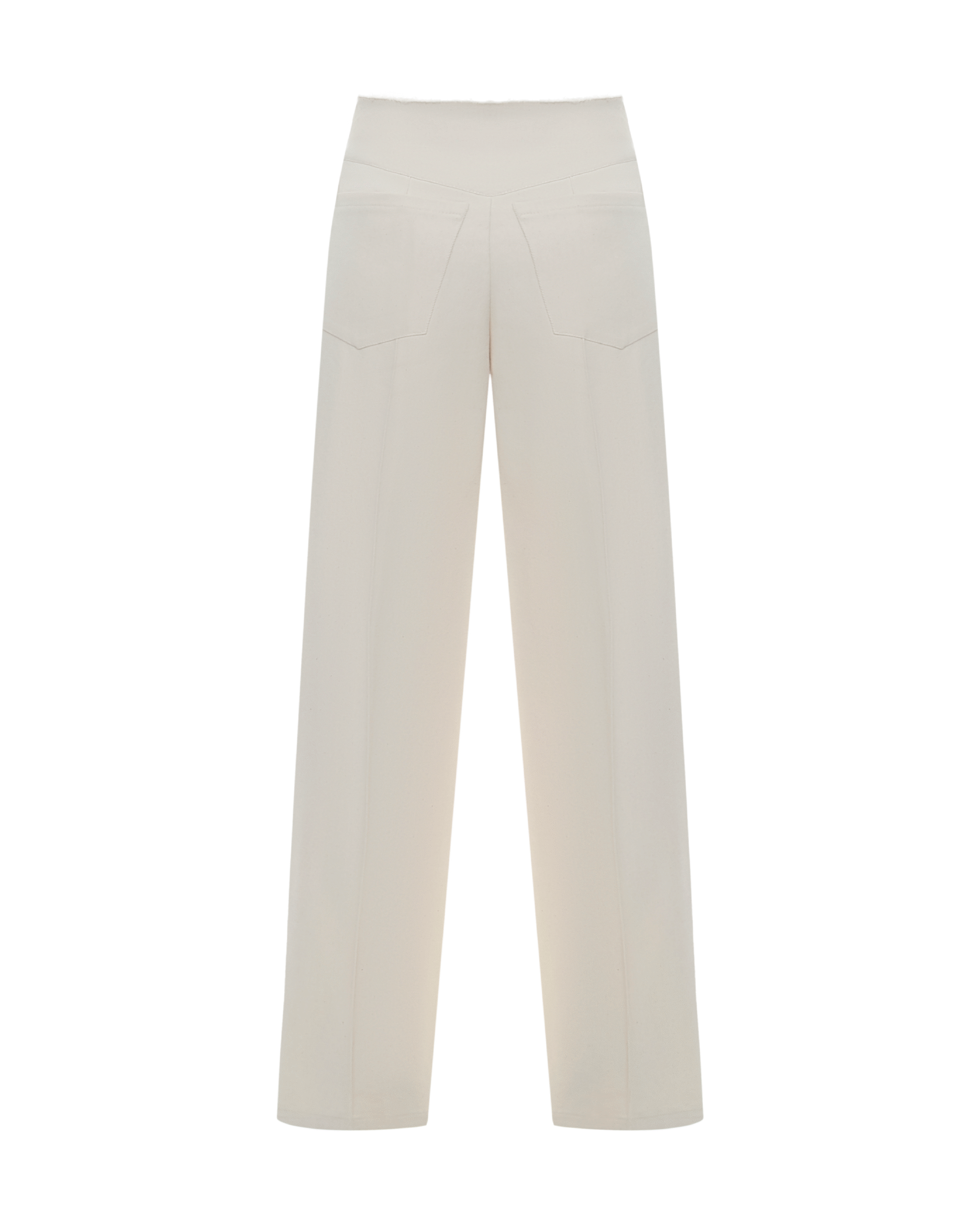 Брюки прямого крою з застроченими стрілками, виготовлені з натурального деніму. Лінія талії занижена, має необроблений край. На передніх половинках брюк є функціональні кишені з відрізним бочком, на задніх половинках- відрізна кокетка та функціональні накладні кишені. Застібаються на потаємну кнопку та блискавну. Довжина виробу у підлогу зі складкою, що закладається.