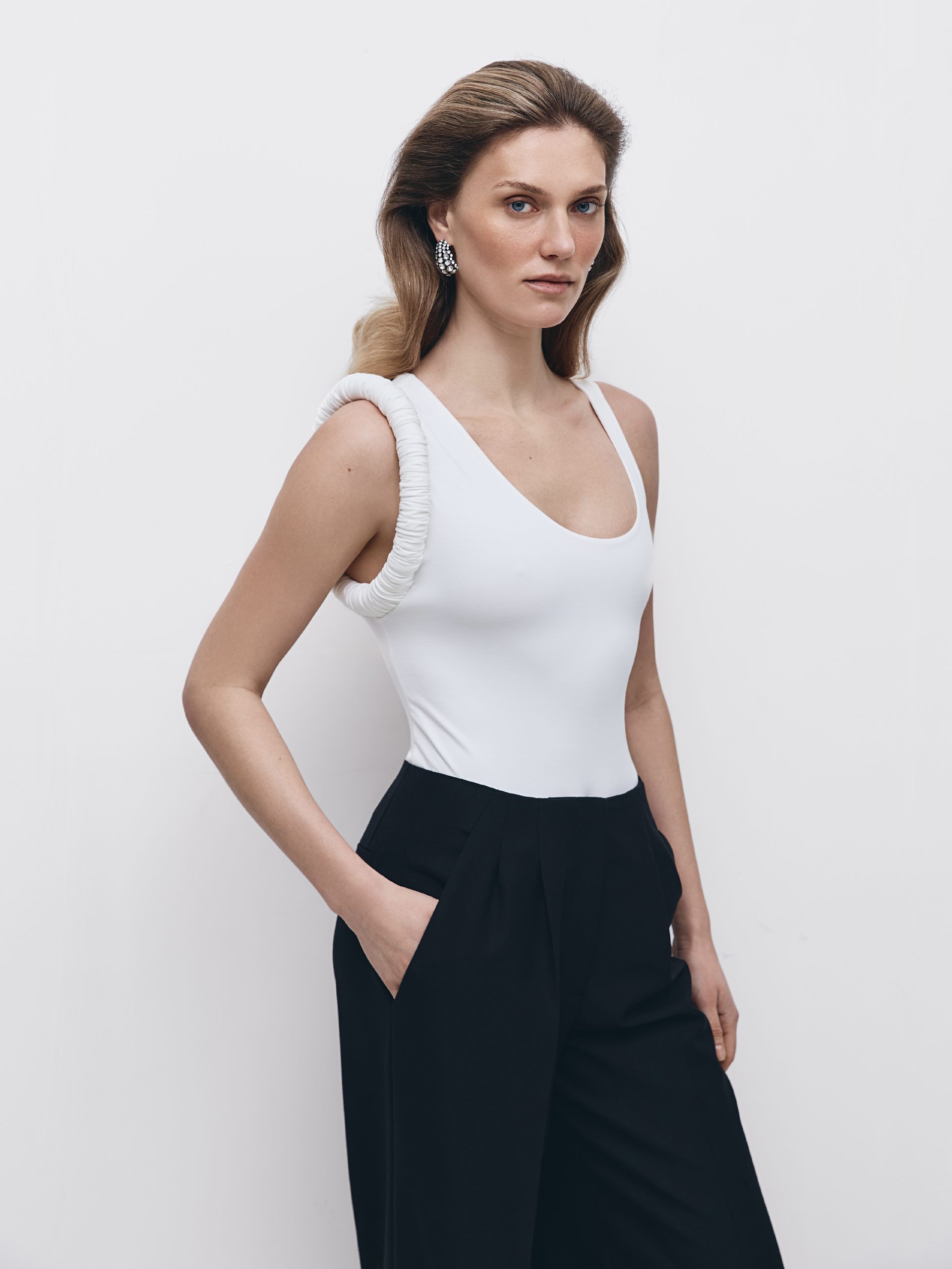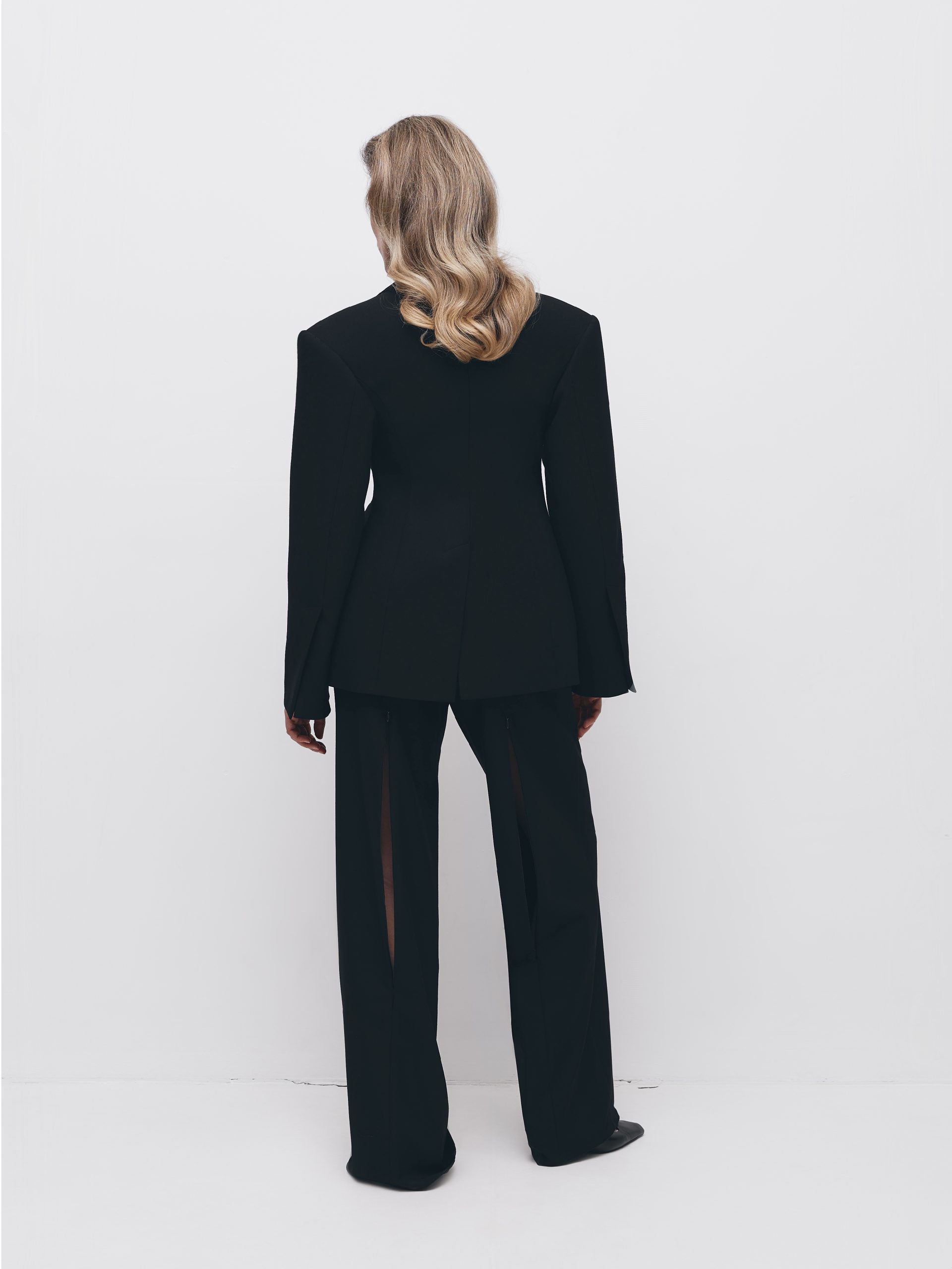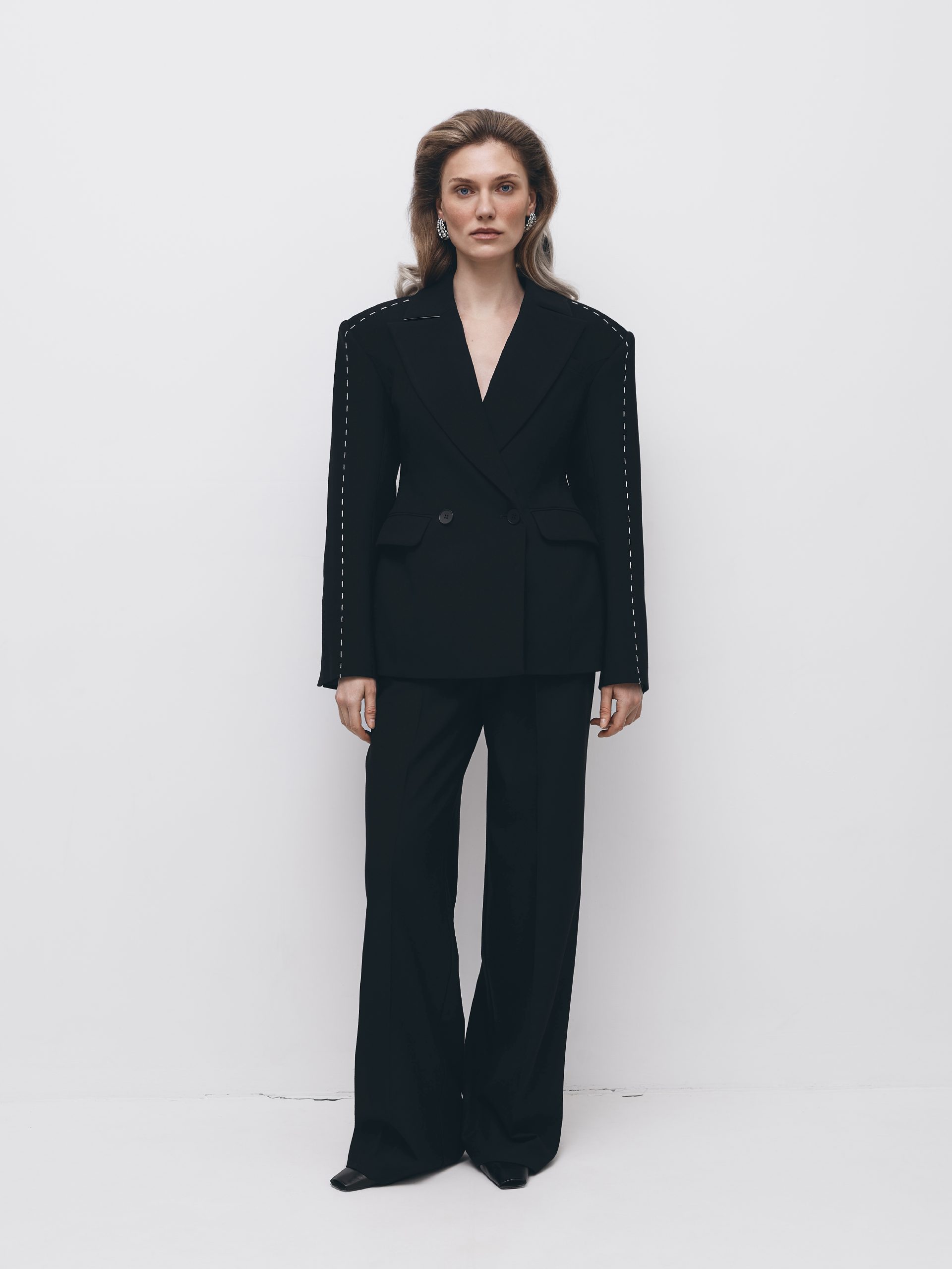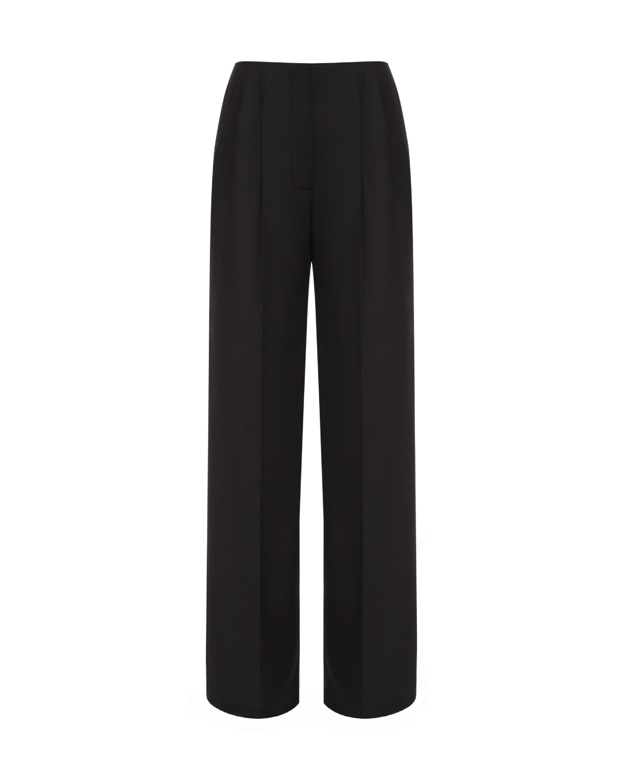 Брюки прямого крою зі стрілками, виготовлені з костюмної тканини з сумішшю вовни. Лінія талії занижена. На передніх половинках брюк є глибокі складки та функціональні кишені, на задніх половинках– рельєфи з потаємними блискавками та нефункціональна кишеня в рамку. Застібаються на потаємні кнопки та блискавку. Довжина виробу у підлогу зі складкою, що закладається.