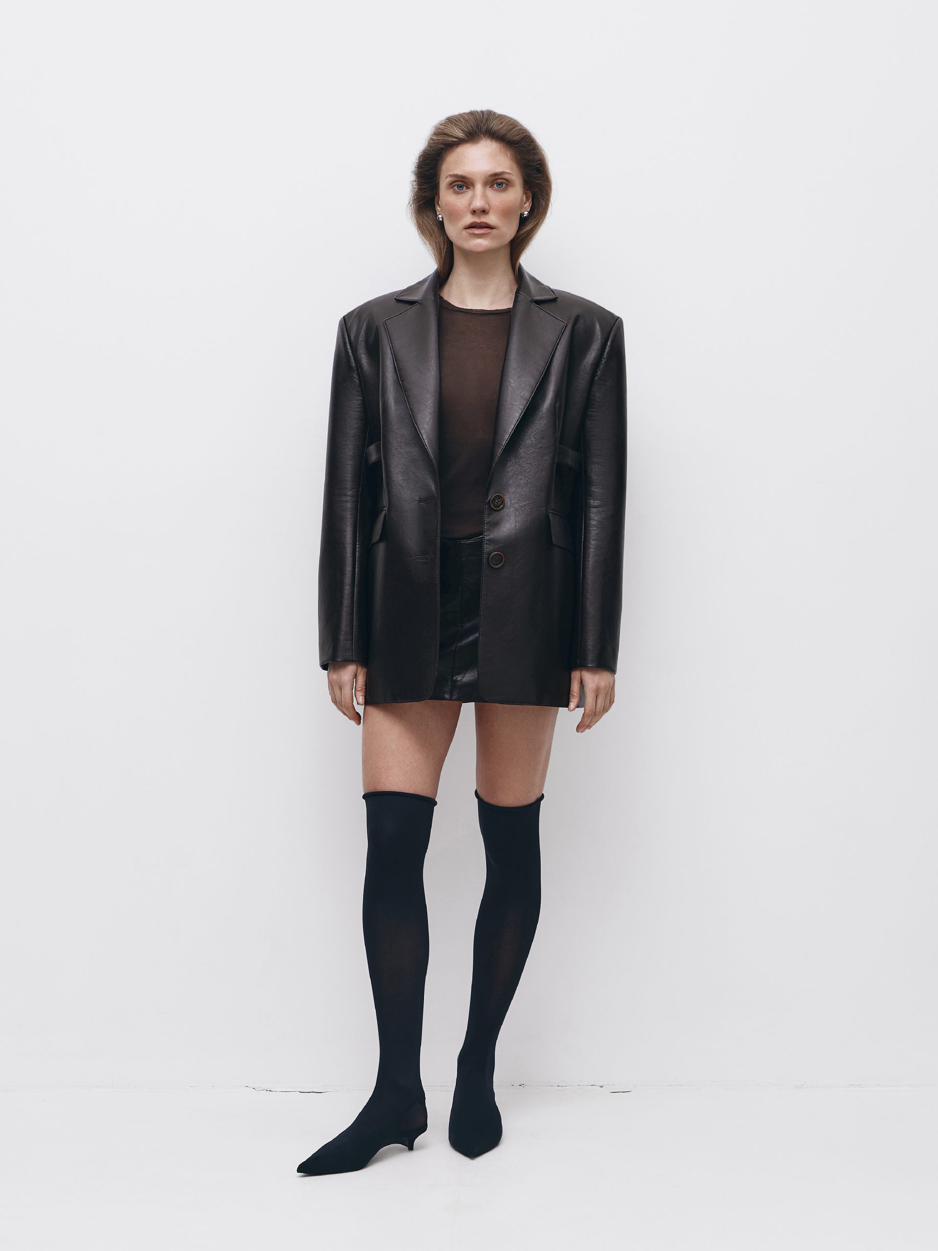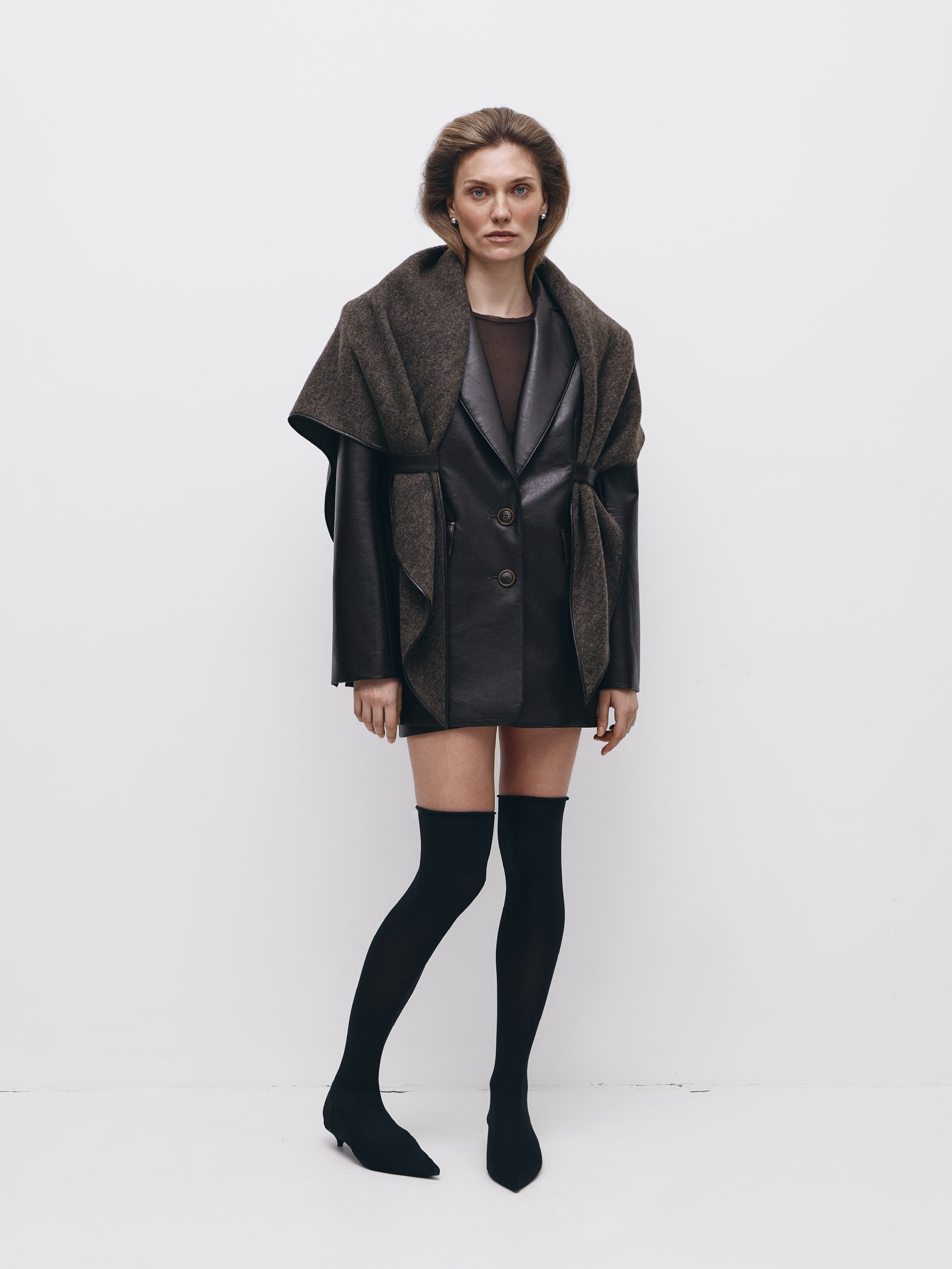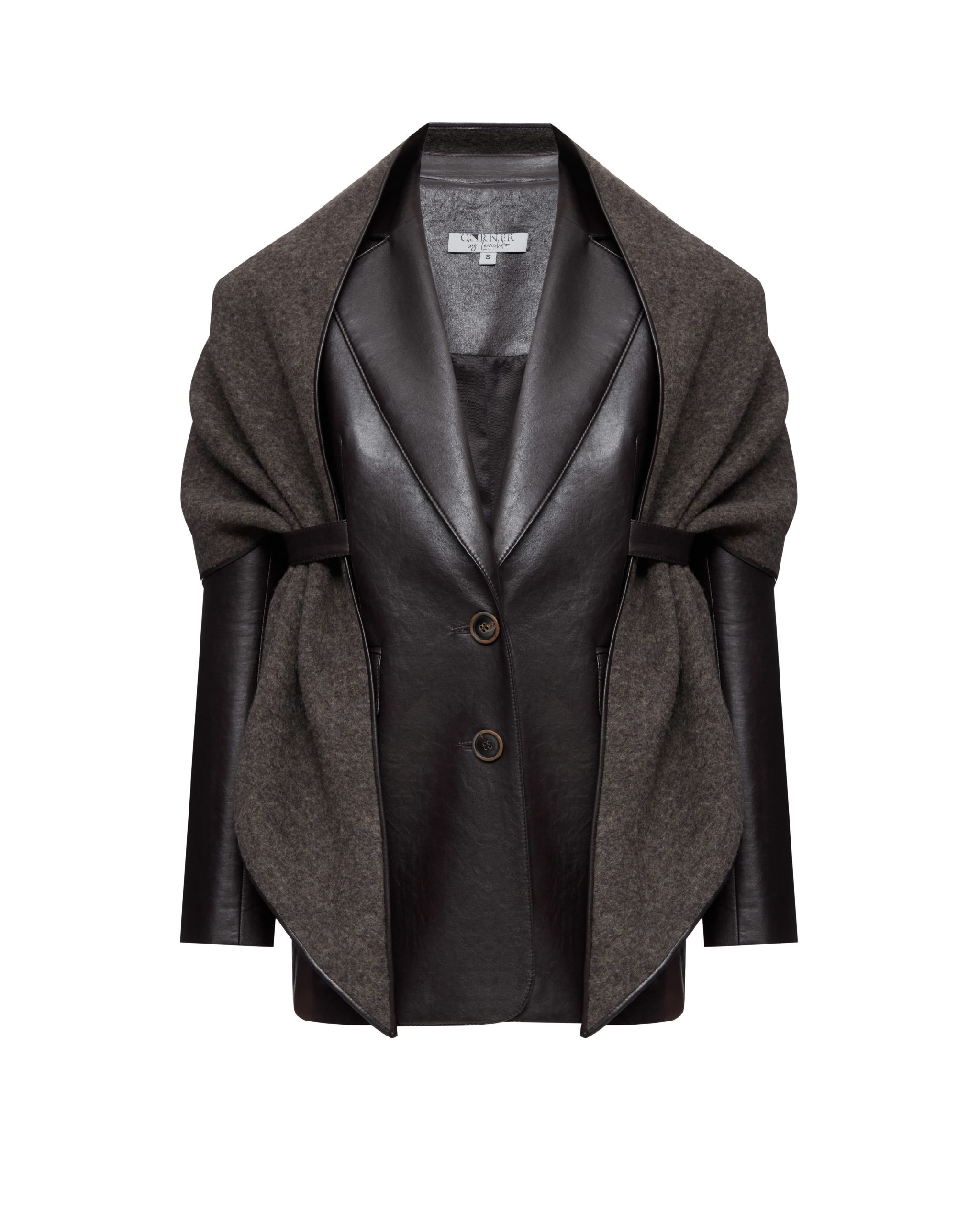 Однобортний жакет прямого крою, виготовлений зі штучної шкіри на підкладці. Виріб має архітектурну розширену лінію плеча та функціональні кишені з клапанами. Рукав двошовний, з відлітними шліцами. Застібається на ґудзики з натурального рогу, має знімну вовняну хустку у комплекті. Довжина жакета до середини стегна.