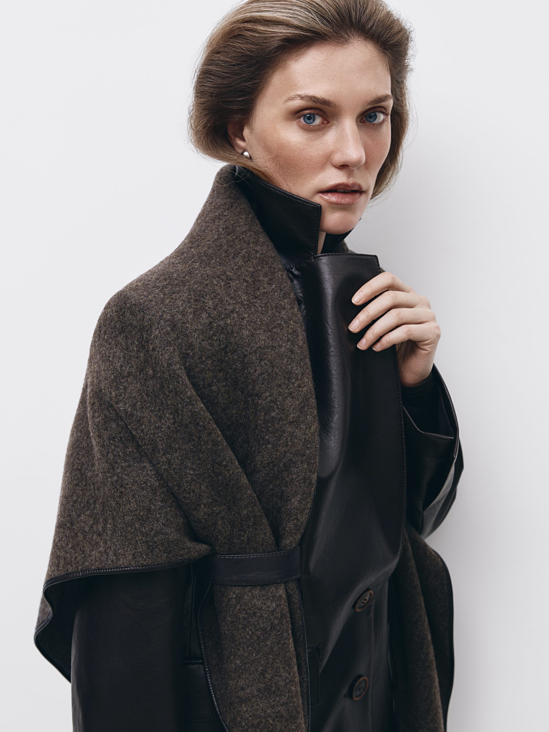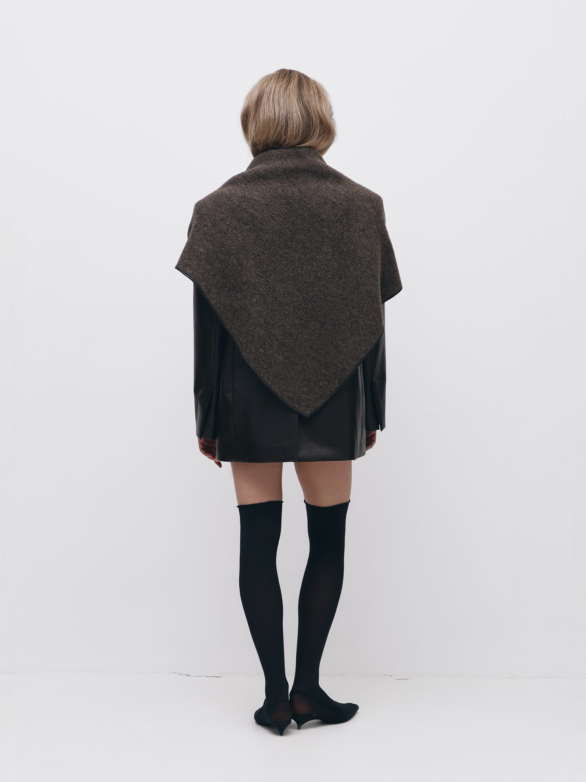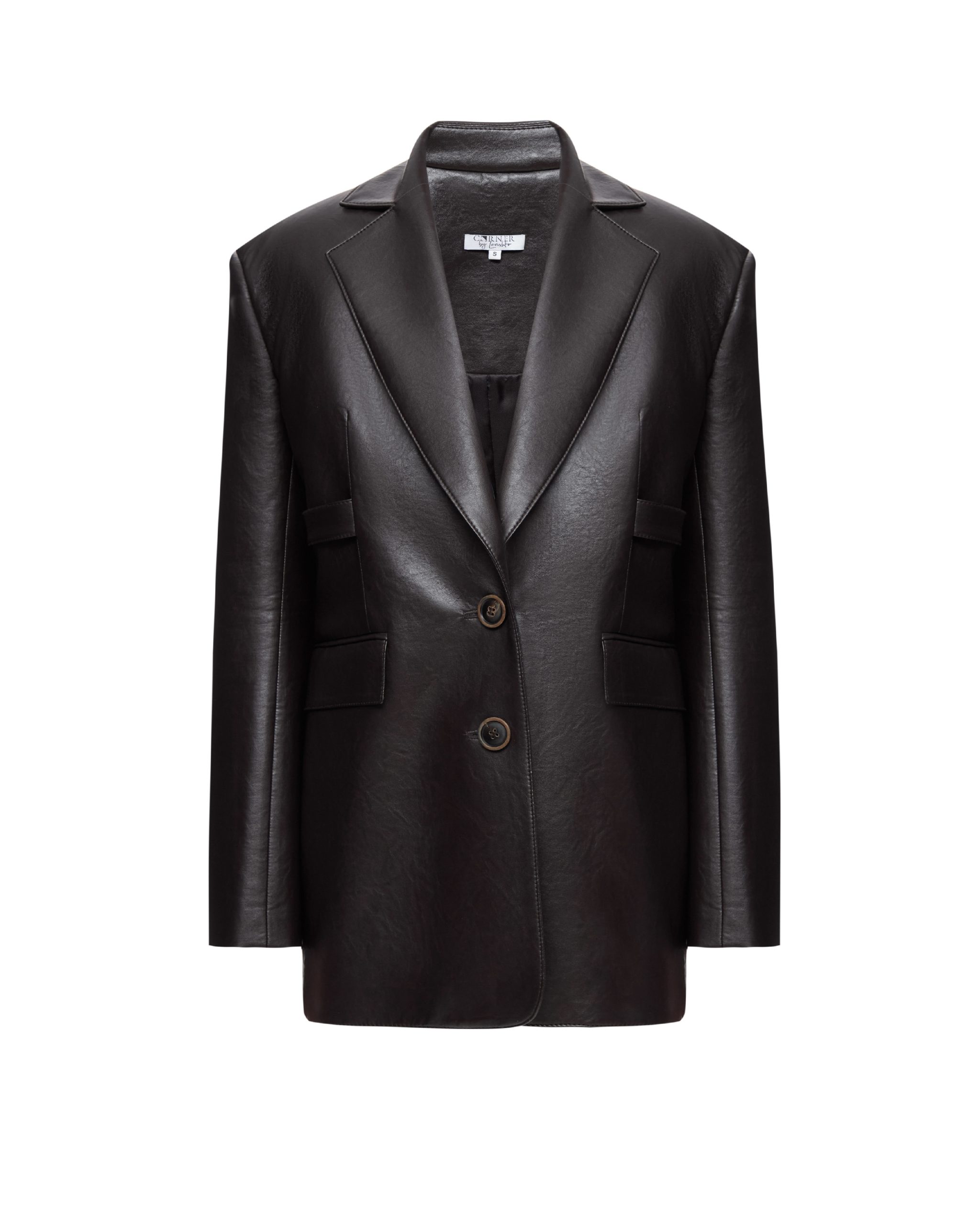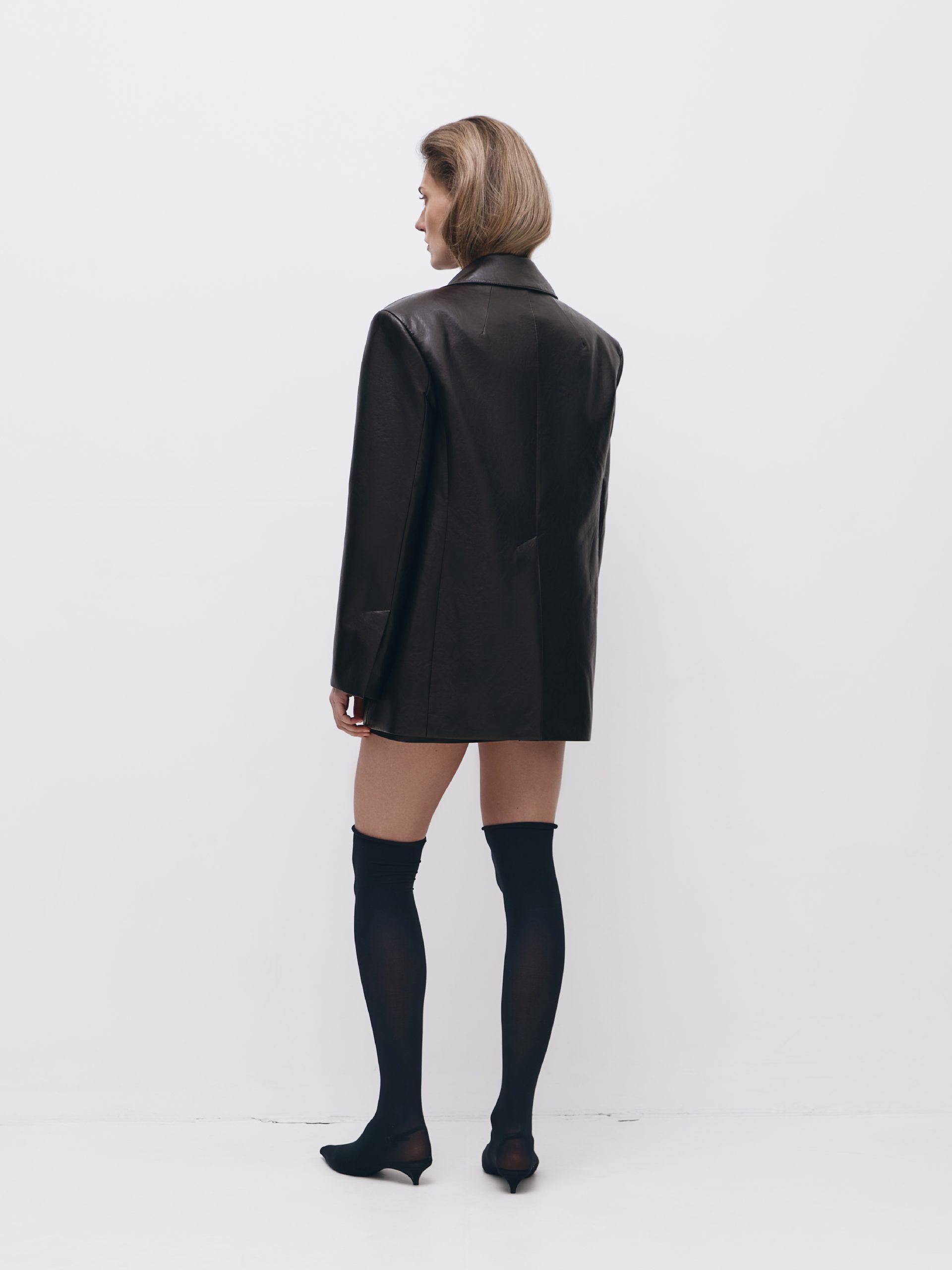 Однобортний жакет прямого крою, виготовлений зі штучної шкіри на підкладці. Виріб має архітектурну розширену лінію плеча та функціональні кишені з клапанами. Рукав двошовний, з відлітними шліцами. Застібається на ґудзики з натурального рогу, має знімну вовняну хустку у комплекті. Довжина жакета до середини стегна.