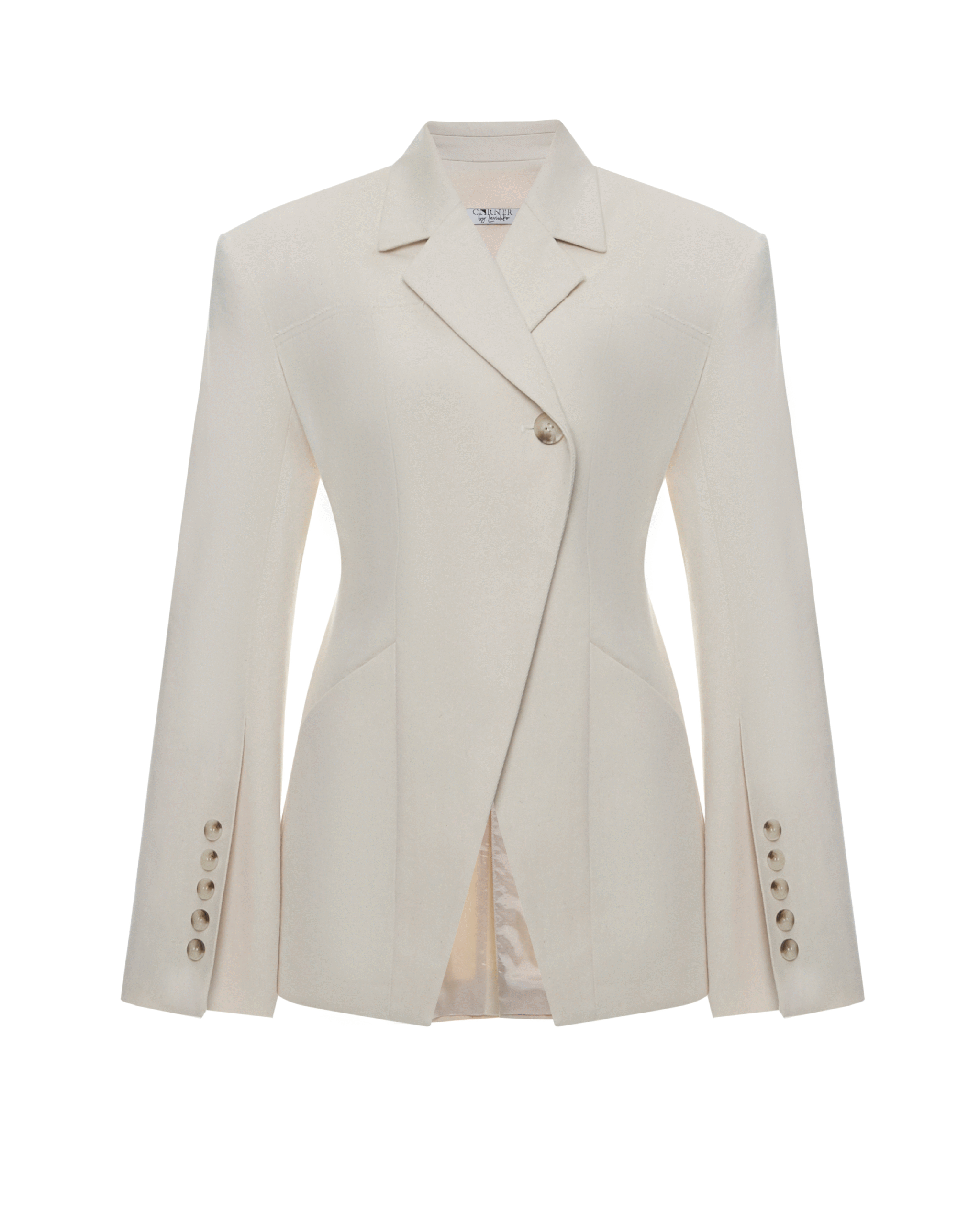 Двуборний жакет приталеного крою, виготовлений з натурального деніму на підкладці. Виріб має архітектурну розширену лінію плеча та функціональні прорізні кишені. Деталі переда та спинки містять рельєфи з відстроченням та необробленими краями. Рукав двошовний з відкритою шліцею. Застібається на ґудзик. Довжина жакету до середини стегна.