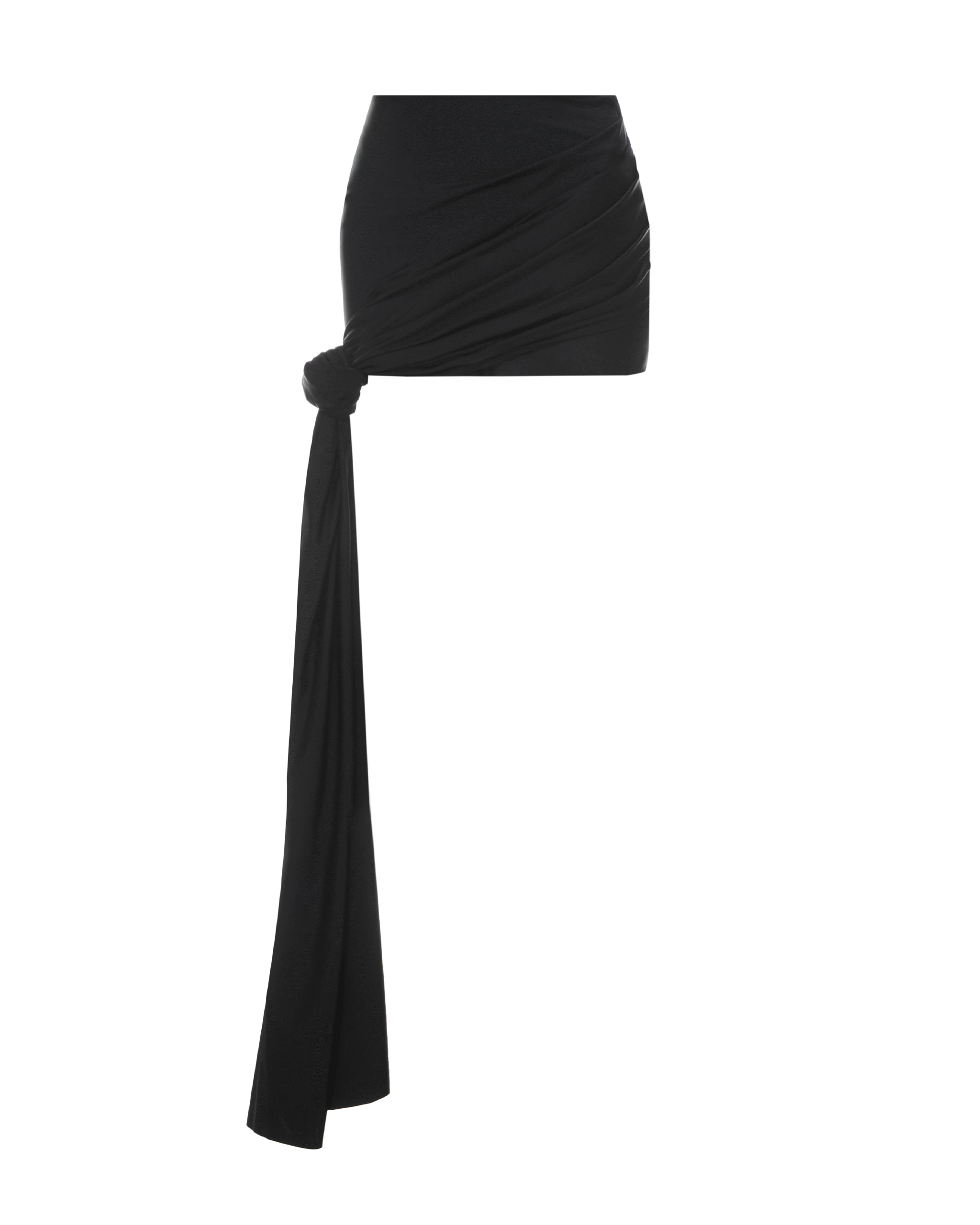 Асиметрична спідниця зі шлейфом, виготовлена з мʼякого матового біфлексу. Виріб має склади та вузол на деталі шлейфу. Застібається на потаємну блискавку в боковому шві. Довжина спідниці міді.