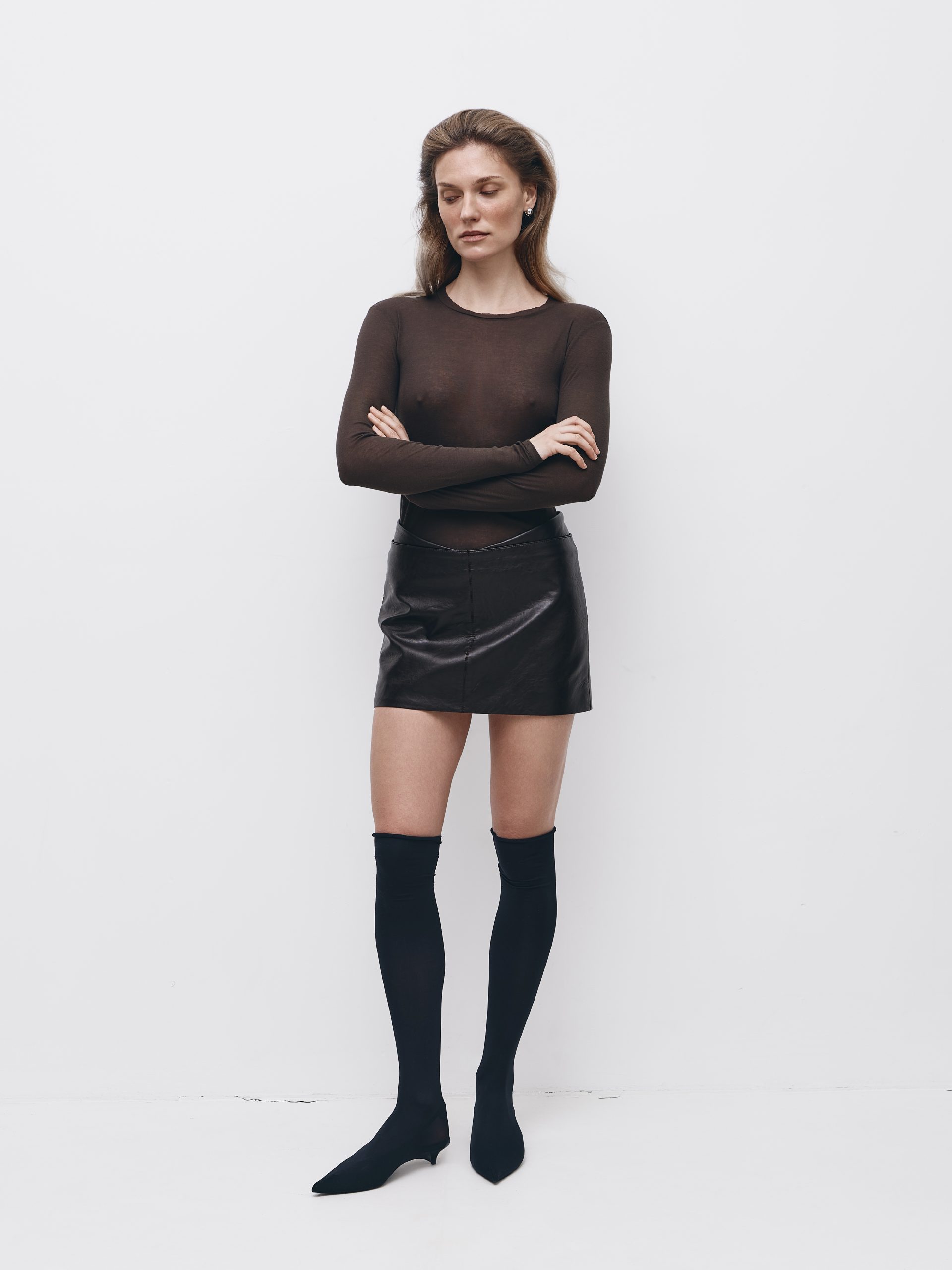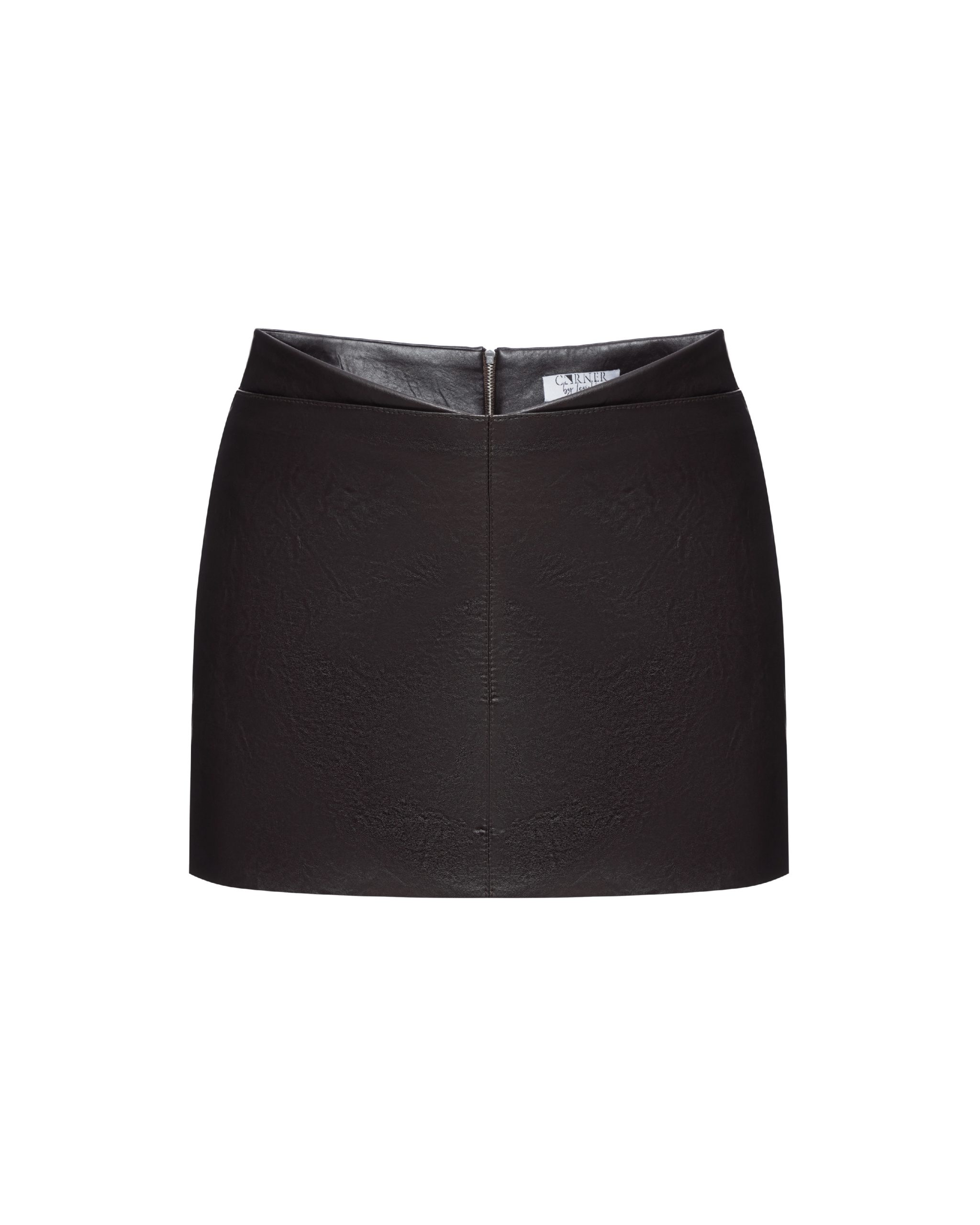 Спідниця-шорти трапецевидного крою, виготовлена зі штучної шкіри на підкладці. Виріб має фігурний V-подібний пояс, центральний середній шов та нефункціональну кишеню в рамку. Застібається на потаємну блискавку в середньому шві. Довжина спідниці міні.