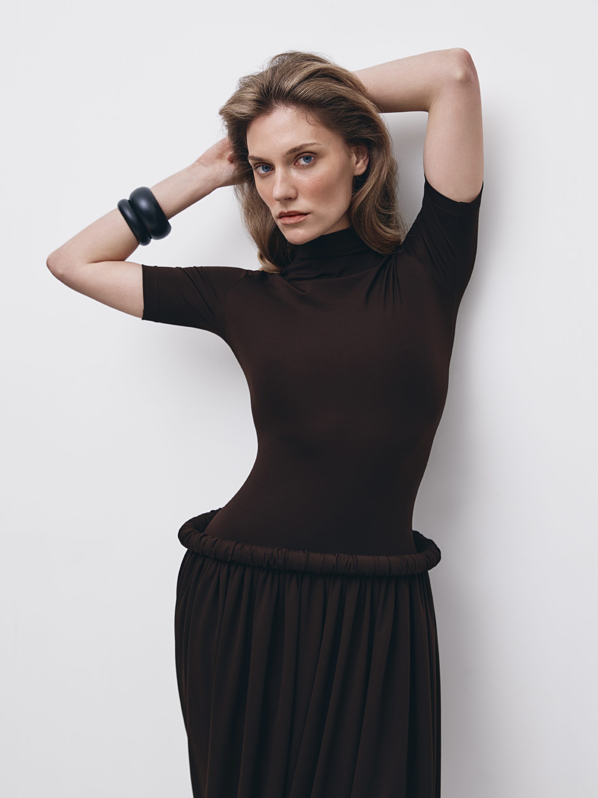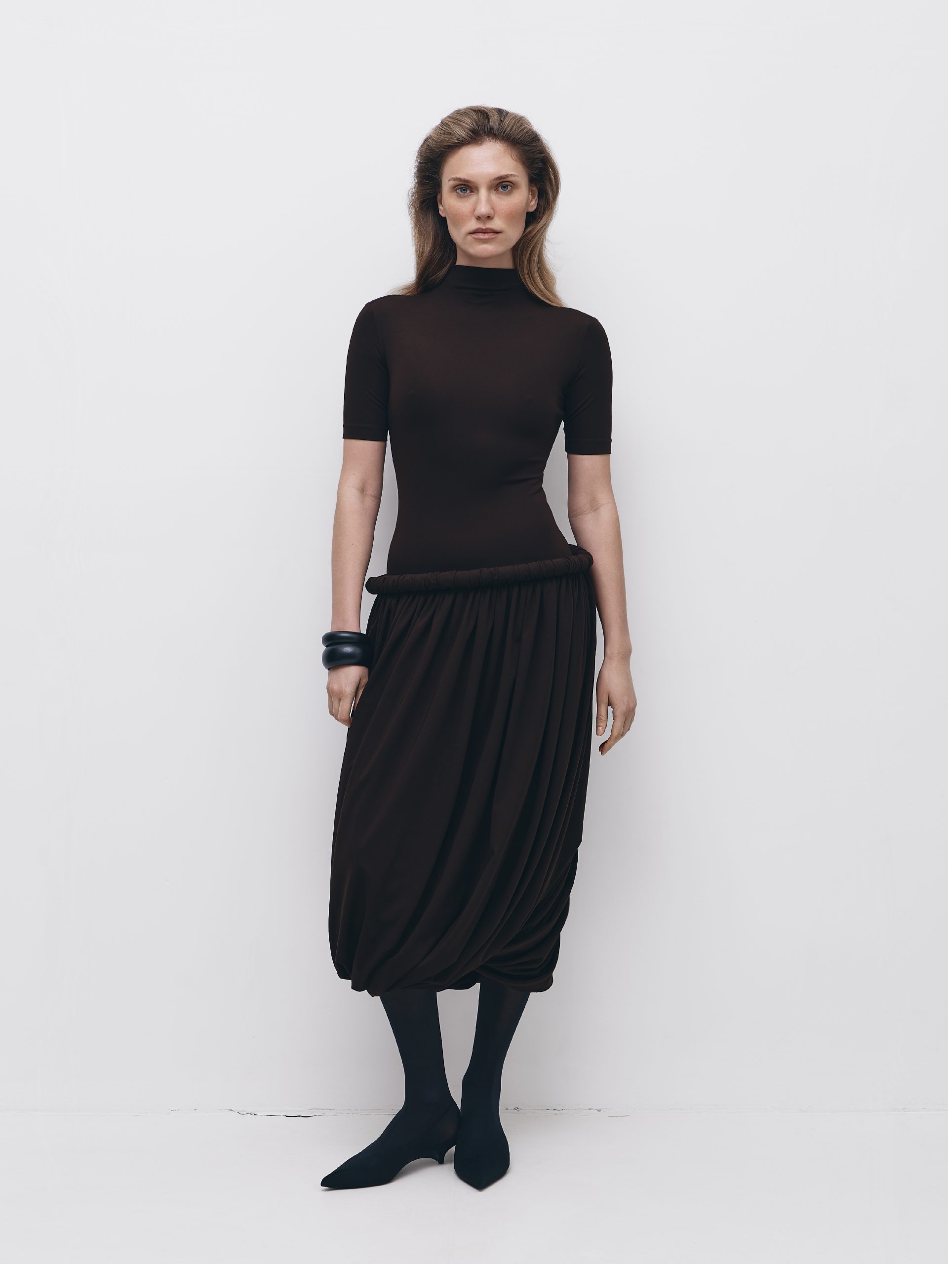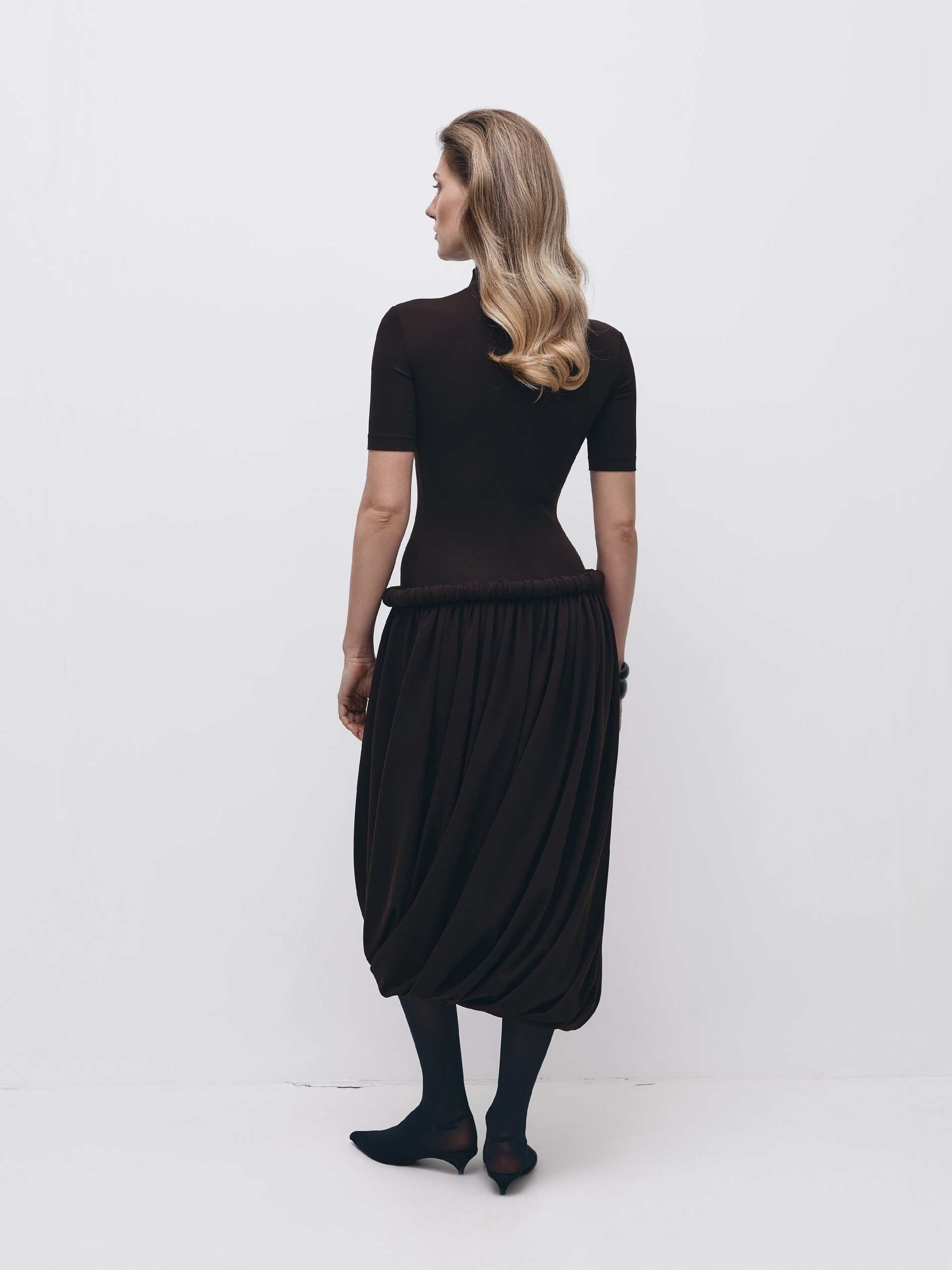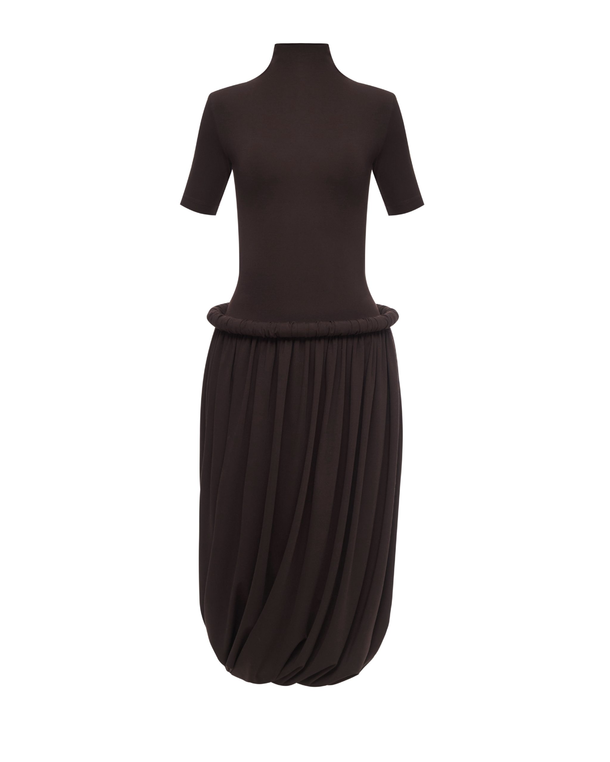 Сукня прилеглого силуету, виготовлена з мʼякого трикотажу. Виріб має комір-стійку, скульптурний буф та подовжену спідницю, що формує мʼякий балонний силует з асиметричним драпіруванням. Застібається на потаємну блискавку в середньому шві. Довжина сукні міді.