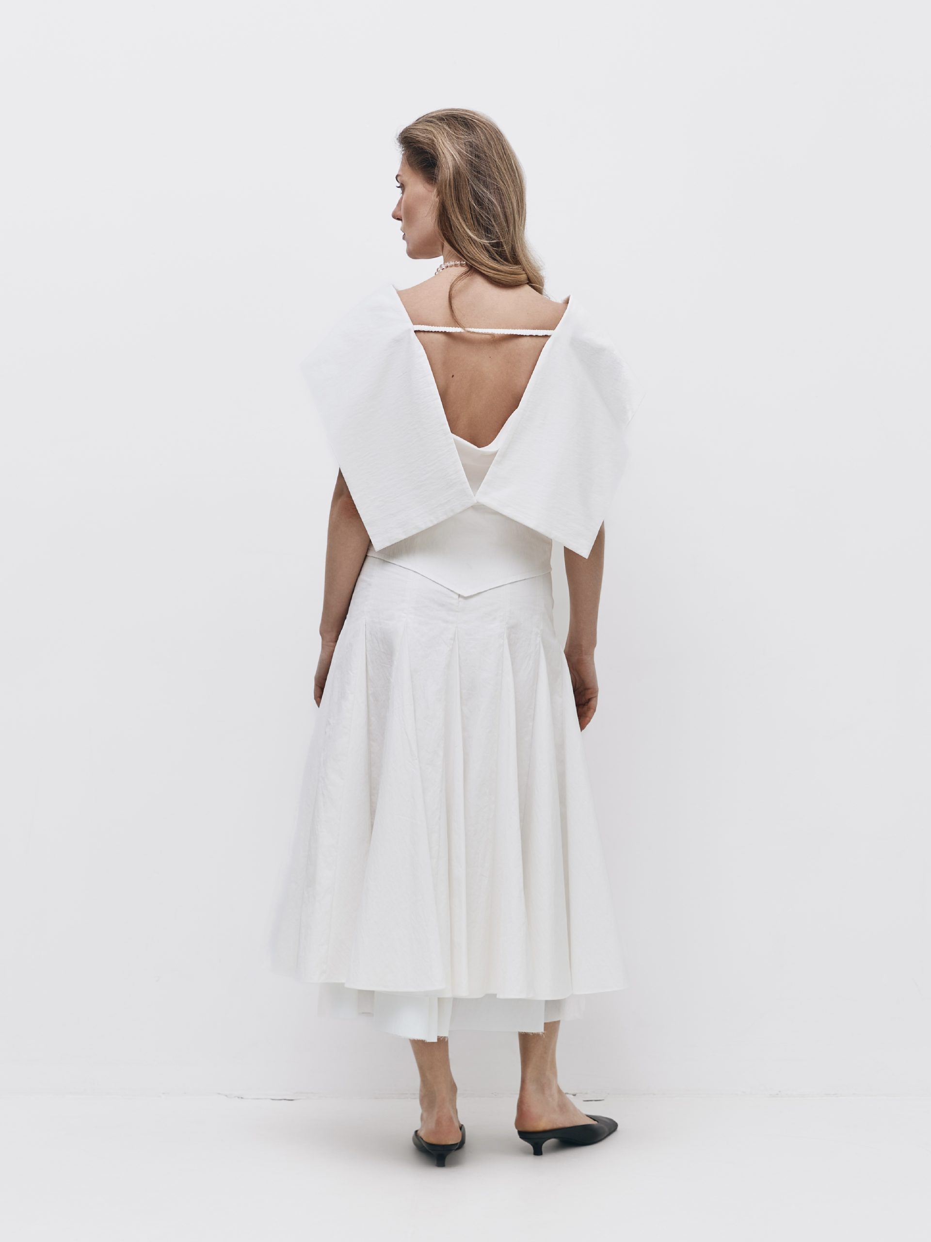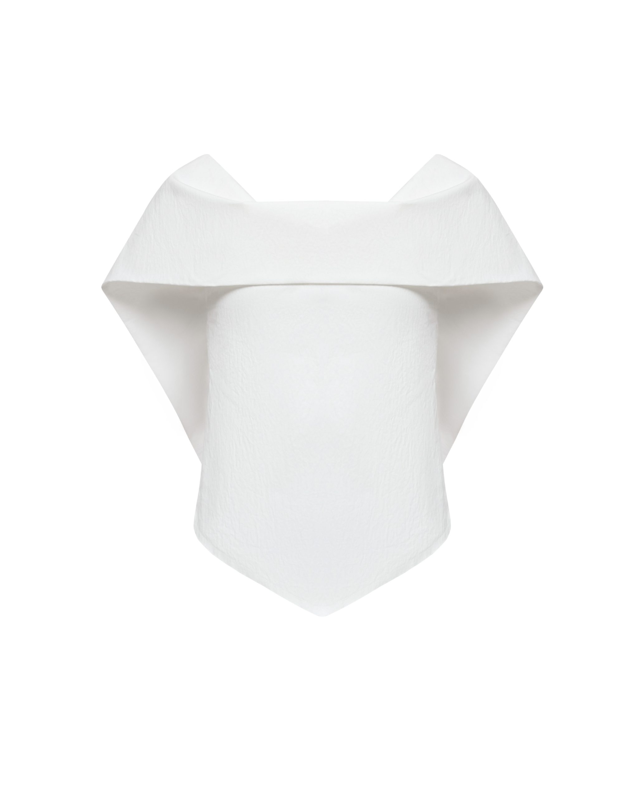 Топ прилеглого силуету, виготовлений з жатої бавовни на підкладці. Перед має структурні плечові деталі та м’яку драпіровку; спинка— глибокий виріз типу «качеля», зафіксований вузькою еластичною стрічкою. Застібається на потаємну блискавку в боковому шві. Довжина топу вище лінії стегон.